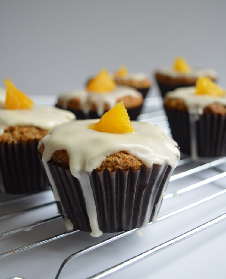 Spread the icing over the top of each cooled bun and leave to set. To finish pop a small segment of orange on top of each muffin to give the egg looking top, perfect for Easter!