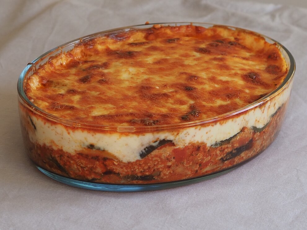 Assemble the moussaka in an ovenproof dish. Start with half of the meat sauce on
